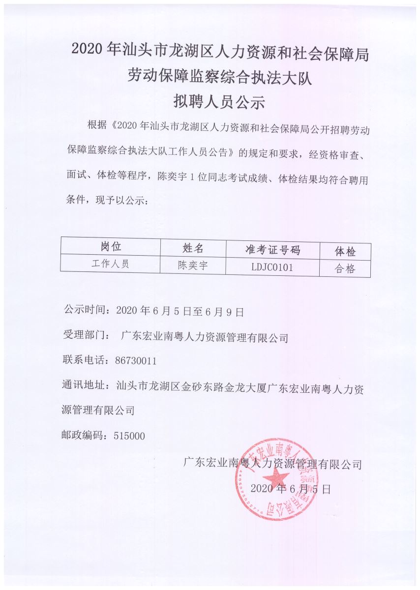 2020年汕头市龙湖区人力资源和社会保障局劳动保障监察综合执法大队拟聘人员公示