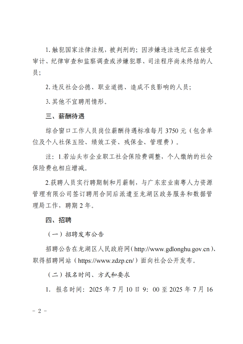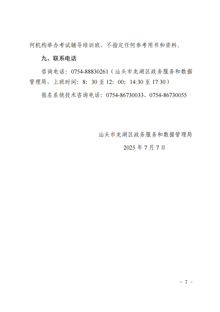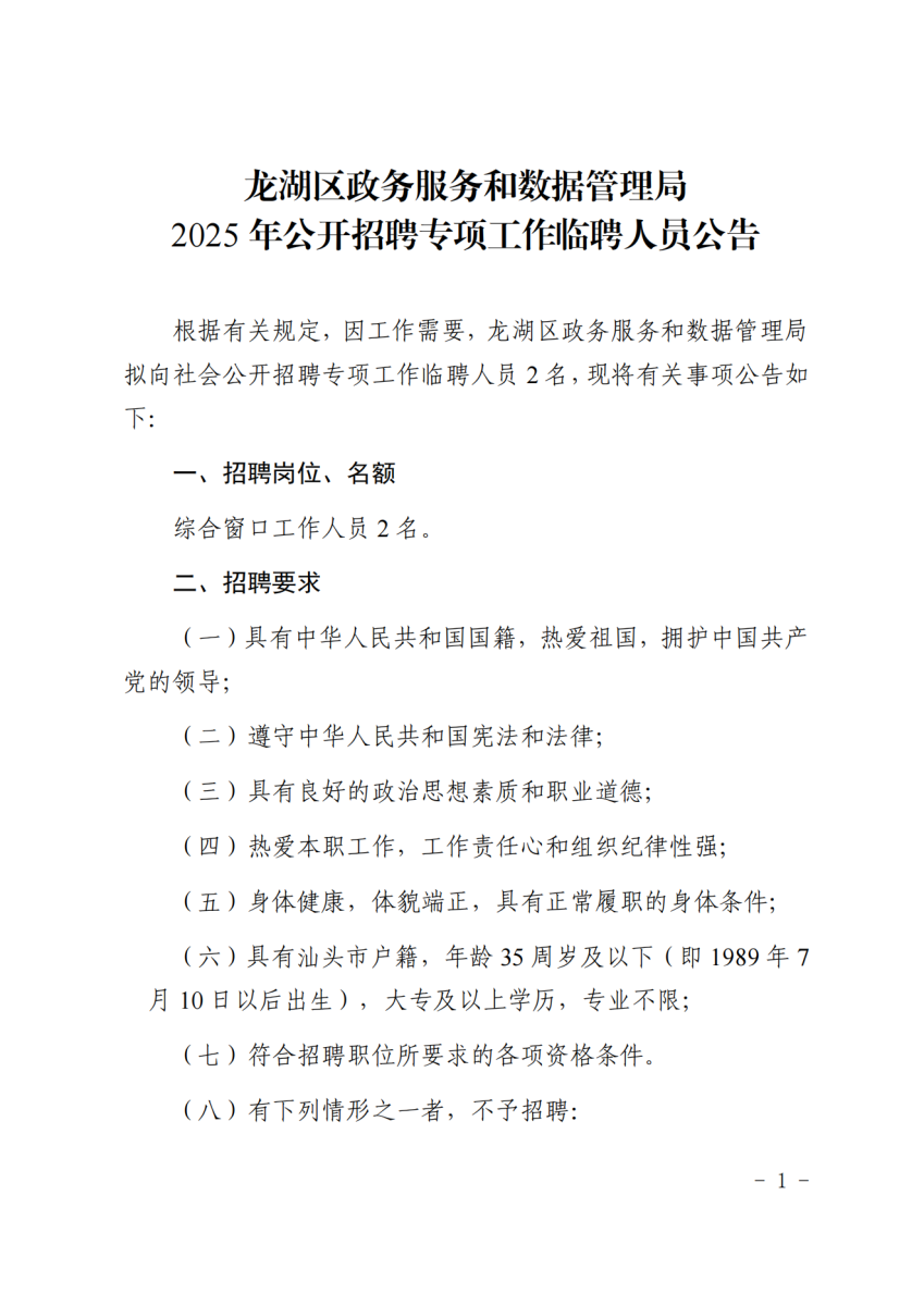 龙湖区政务服务和数据管理局2025年公开招聘专项工作临聘人员公告