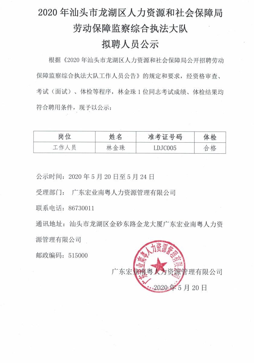 2020年汕头市龙湖区人力资源和社会保障局劳动保障监察综合执法大队拟聘人员公示