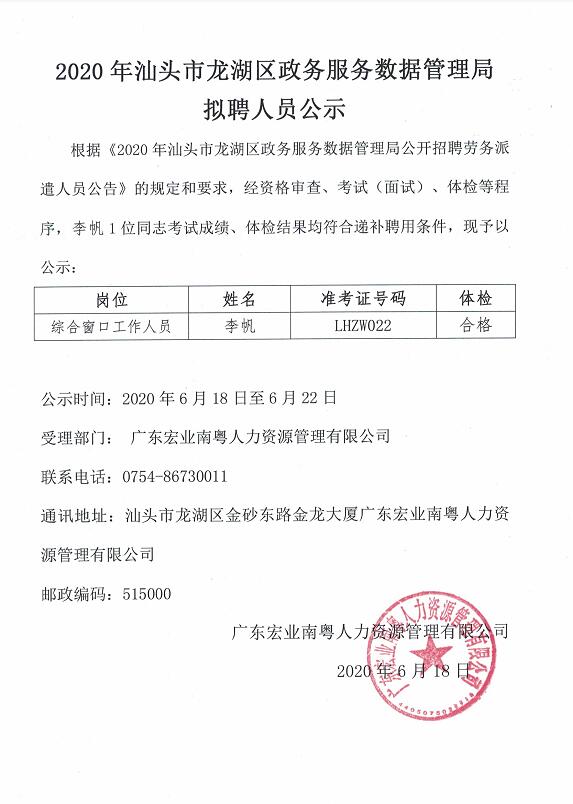 2020年汕头市龙湖区政务服务数据管理局拟聘人员公示
