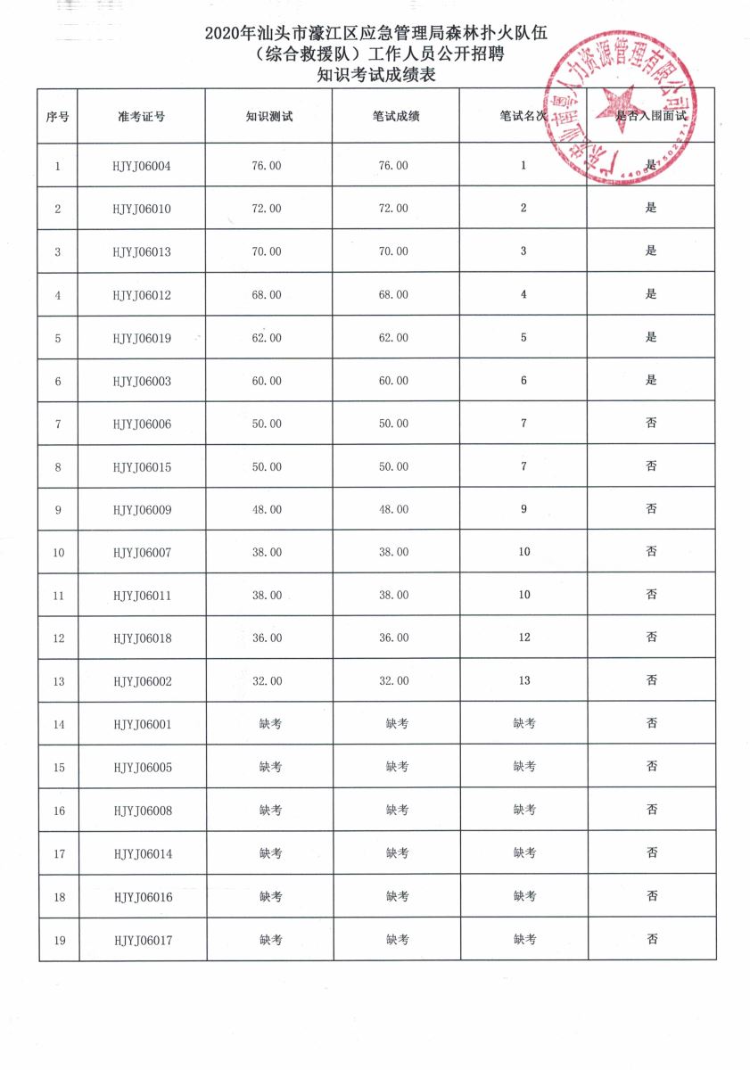 2020年汕头市濠江区应急管理局森林扑火队伍(综合救援队)工作人员公开招聘笔试成绩公告