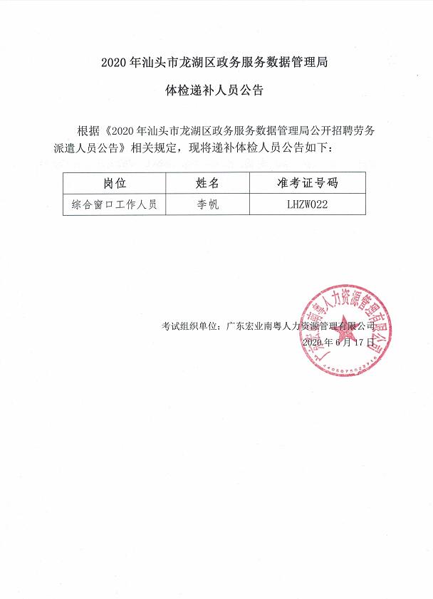 2020年汕头市龙湖区政务服务数据管理局体检递补人员公告