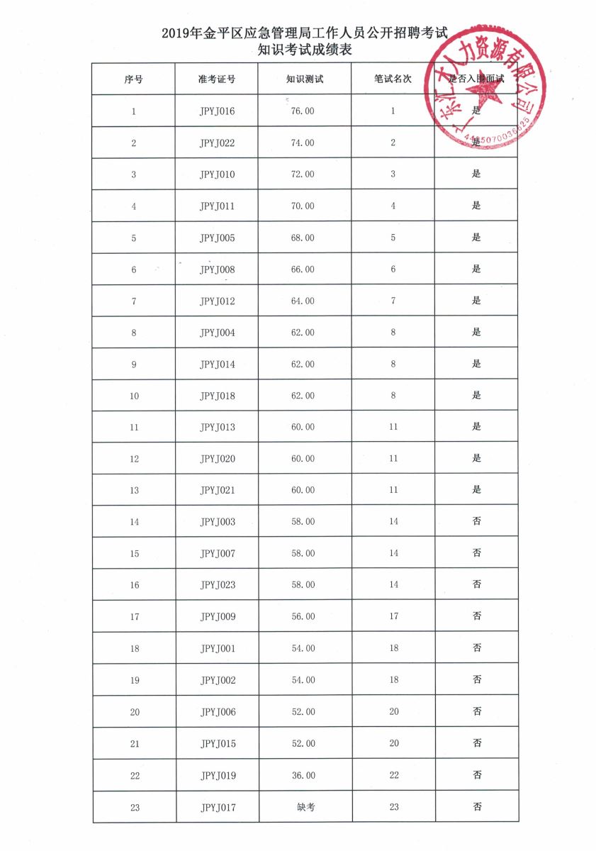 2019年金平区应急管理局工作人员公开招聘考试成绩公告
