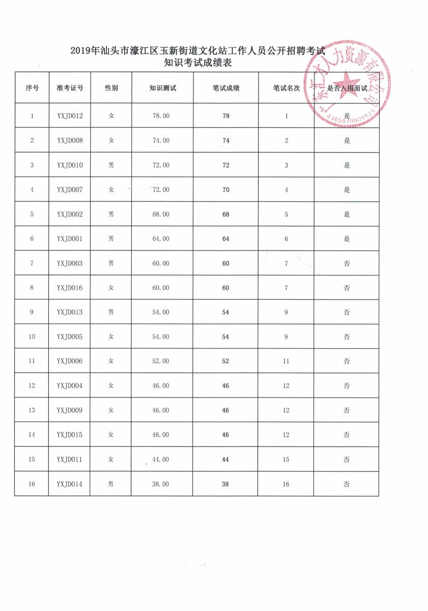2019年汕头市濠江区玉新街道文化站工作人员公开招聘考试成绩公告