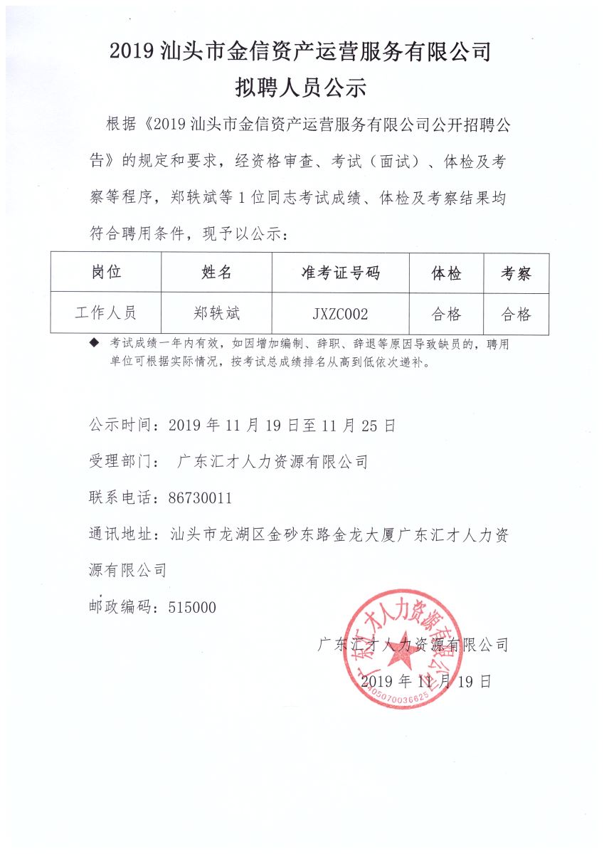 2019年汕头市金信资产运营服务有限公司拟聘人员公示