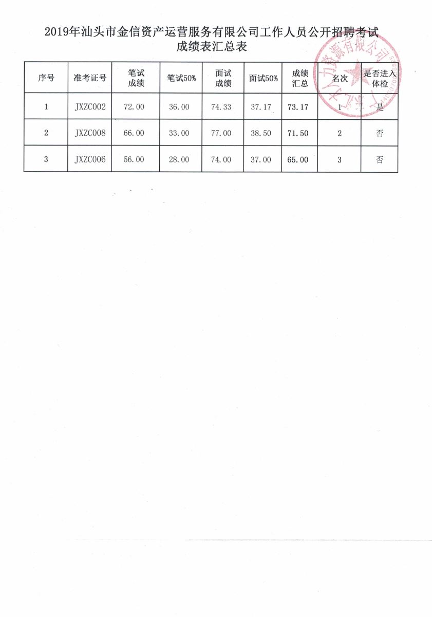 2019年汕头市金信资产运营有限公司工作人员公开招聘考试成绩公告