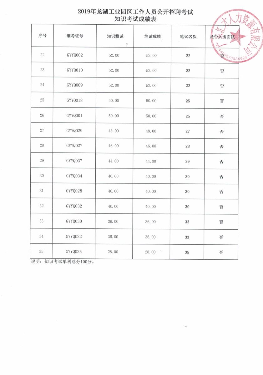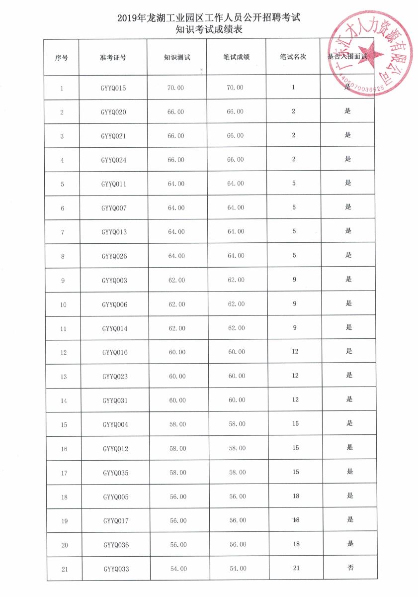 2019年龙湖工业园区工作人员公开招聘考试知识考试成绩公告