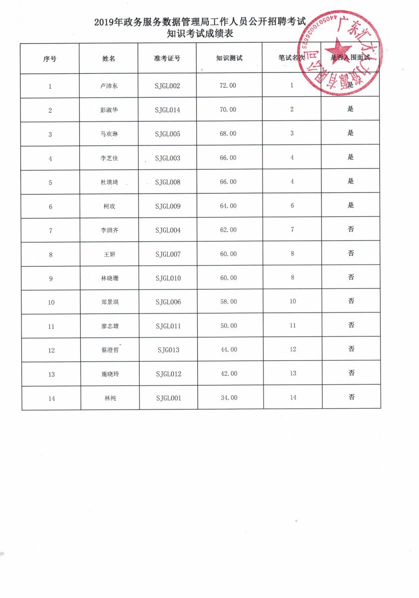 2019年政务服务数据管理局工作人员公开招聘考试成绩公告