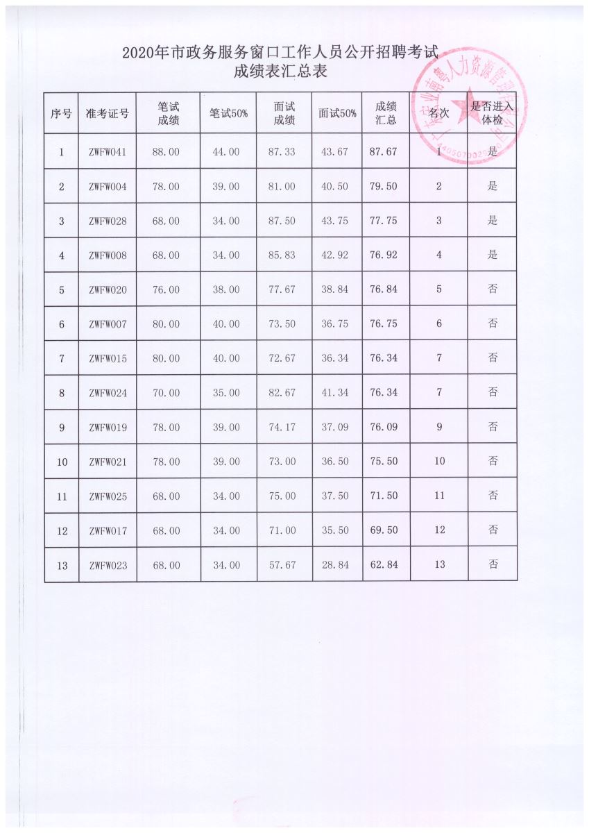 2020年市政务服务窗口工作人员公开招聘考试成绩公告
