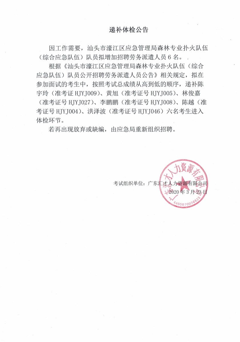 2020年汕头市濠江区应急管理局森林扑火队伍递补体检公告