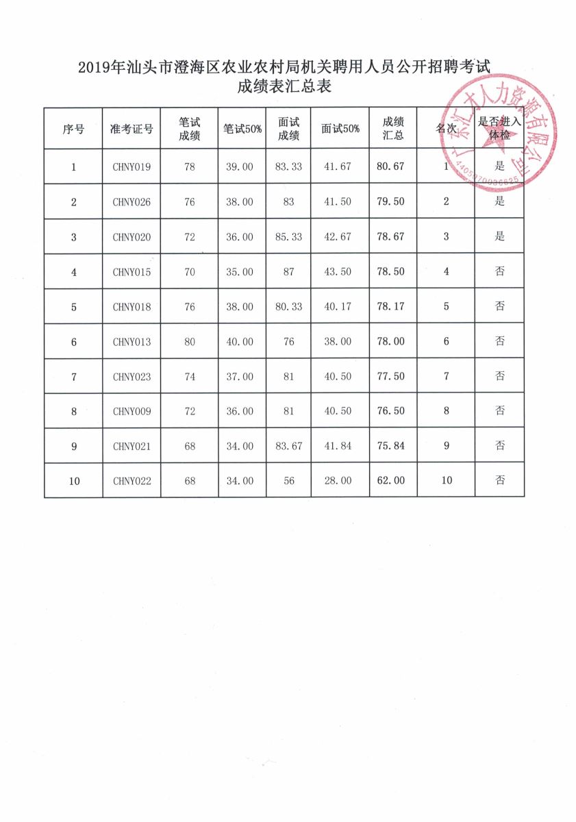 2019年汕头市澄海区农业农村局机关聘用人员公开招聘考试成绩公告