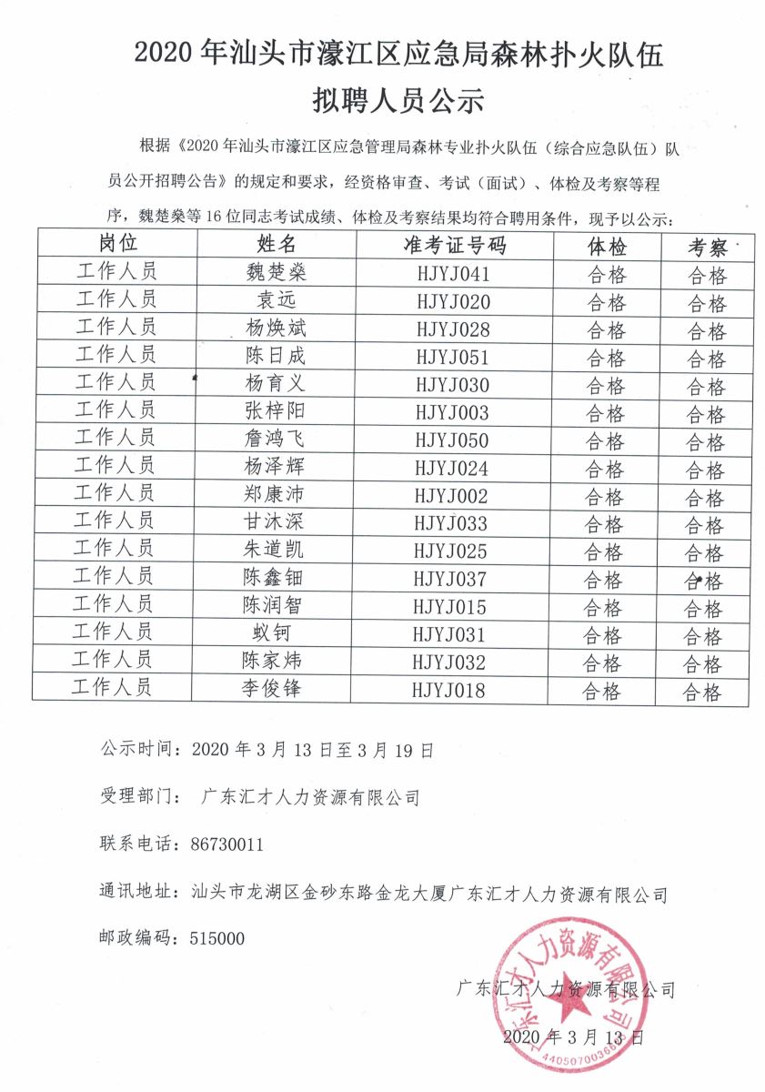 2020年汕头市濠江区应急局森林扑火队伍 拟聘人员公示
