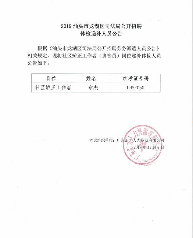 2019年汕头龙湖区司法局公开招聘体检递补人员公告
