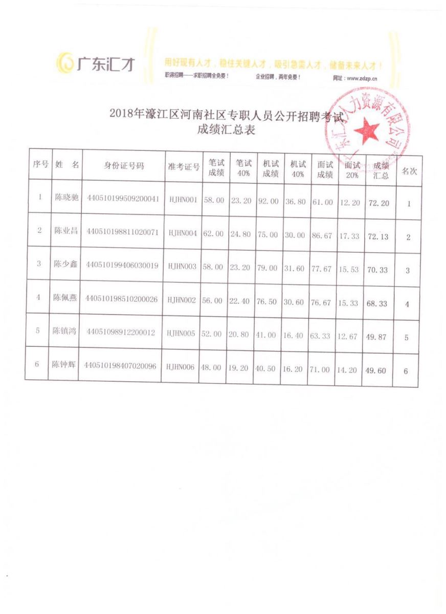 2018年濠江河南社区专职人员公开招聘考试成绩汇总表公示