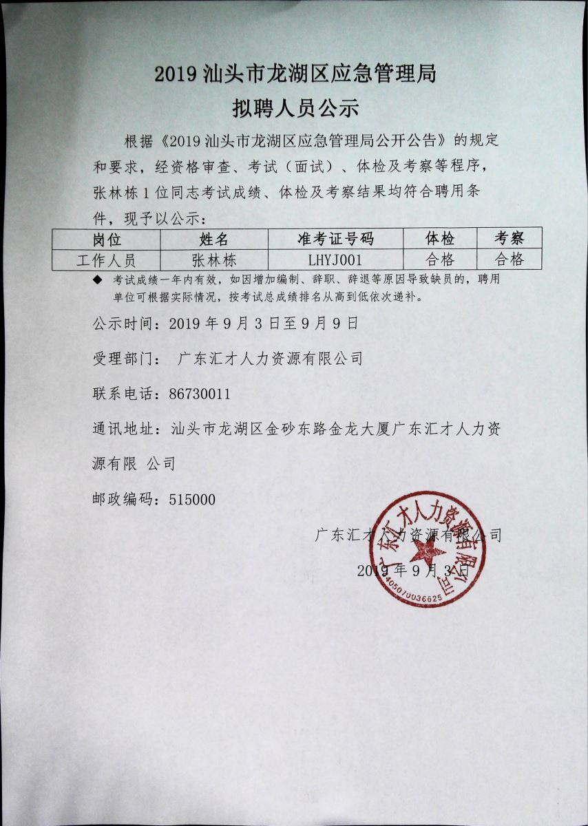 2019汕头市龙湖区应急管理局拟聘人员公示