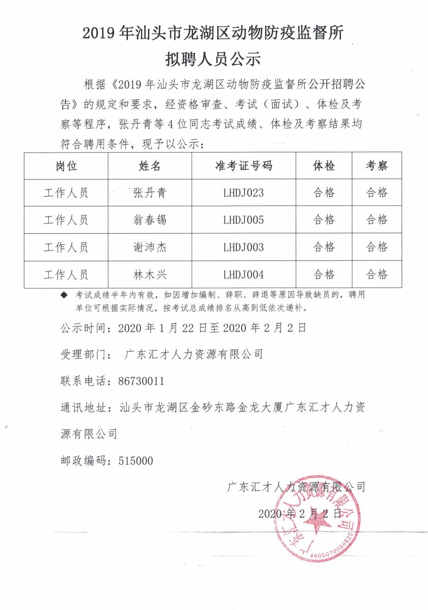 2019年汕头市龙湖区动物防疫监督所拟聘人员公示