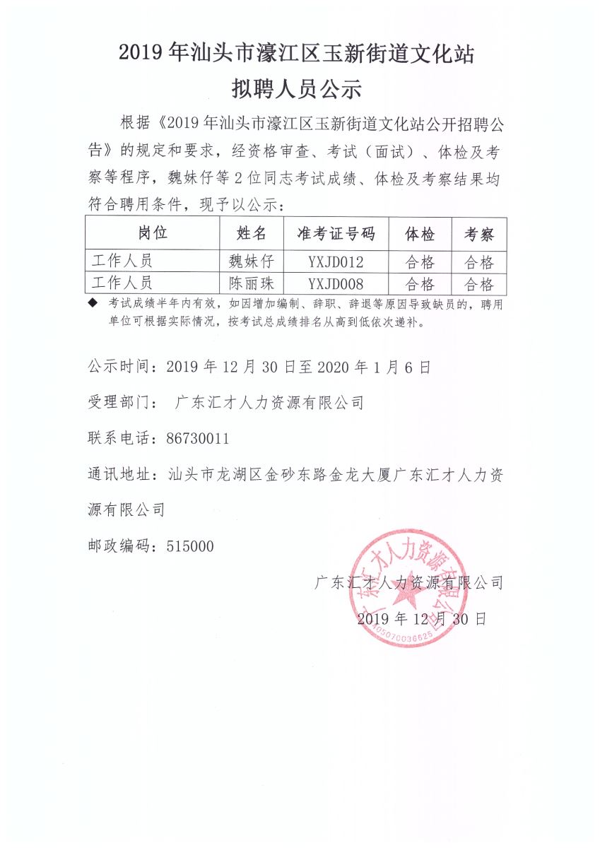 2019年汕头市濠江区玉新街道文化站拟聘人员公示