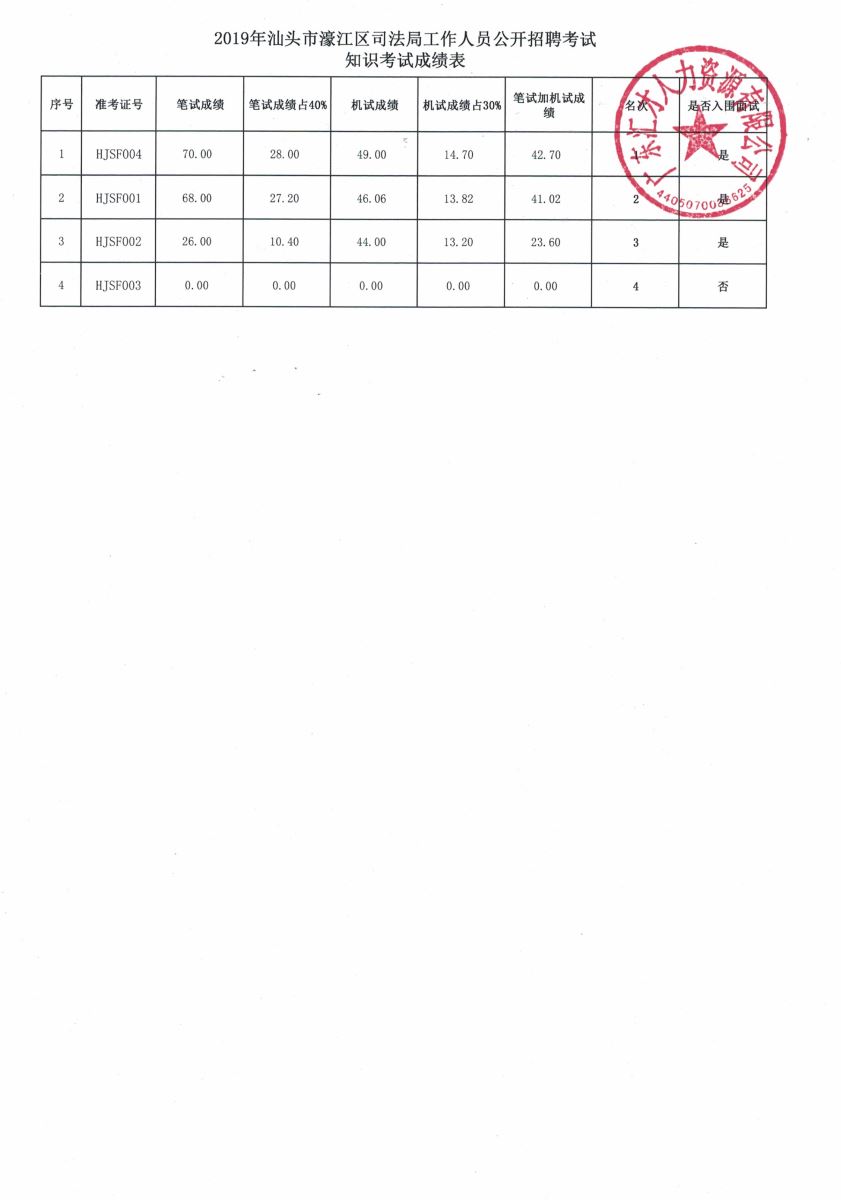 2019年濠江区司法局工作人员公开招聘考试成绩公告