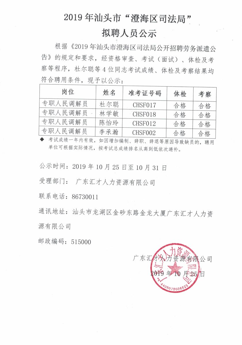 2019年澄海去司法局工作人员公开招聘考试成绩公告