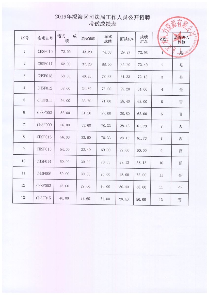 2019年澄海去司法局工作人员公开招聘考试成绩公告