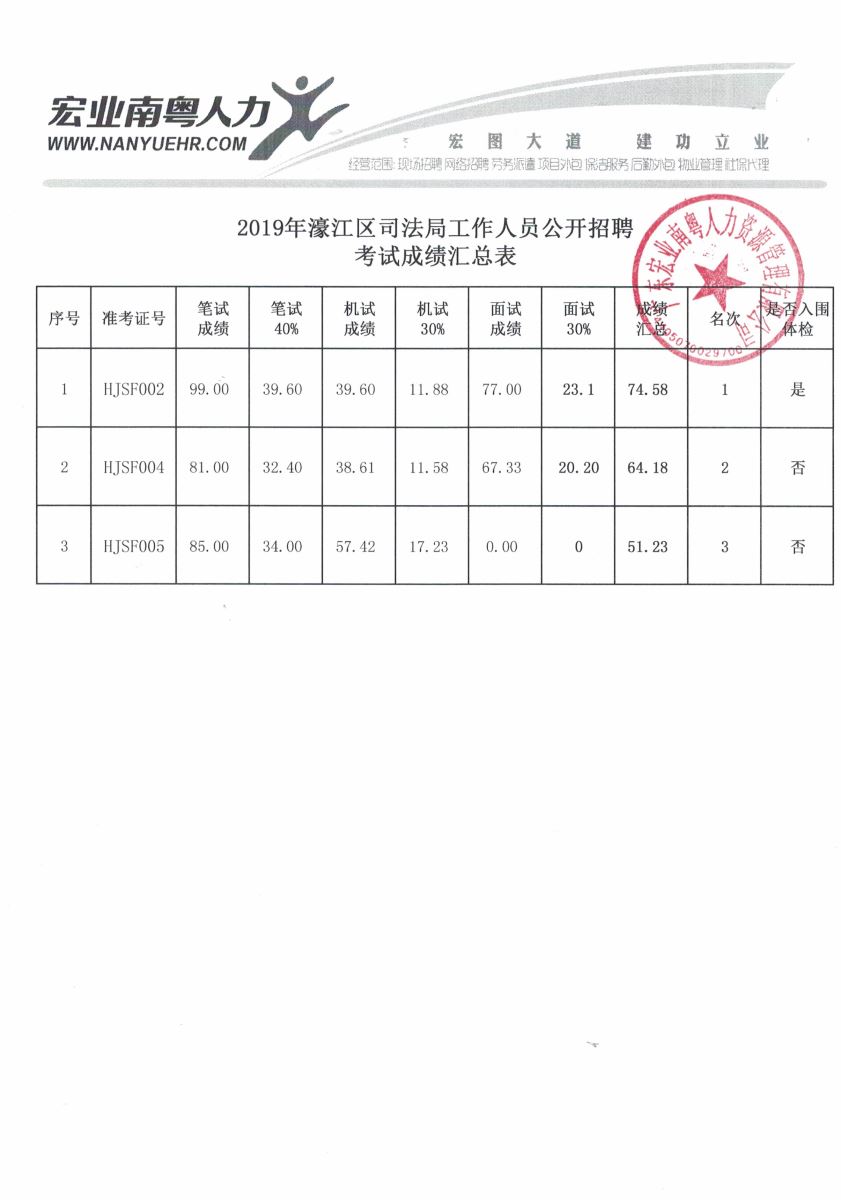 2019年濠江区司法局工作人员公开招聘考试成绩汇总表