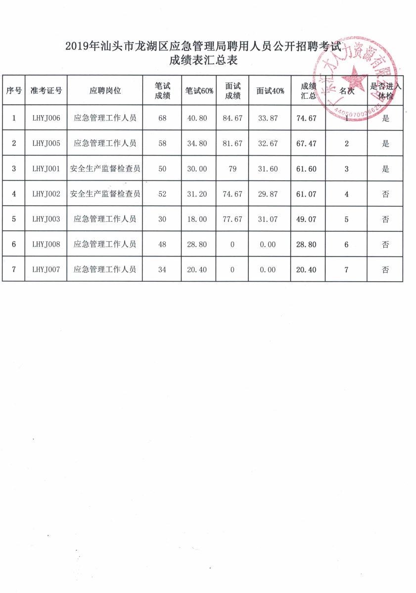 2019年汕头市龙湖区应急管理局公开招聘考试成绩公示