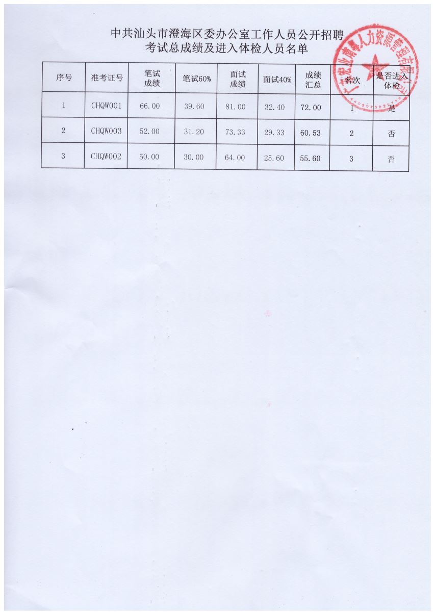 中共汕头市澄海区委办公室工作人员公开招聘考试总成绩及进入体检人员名单