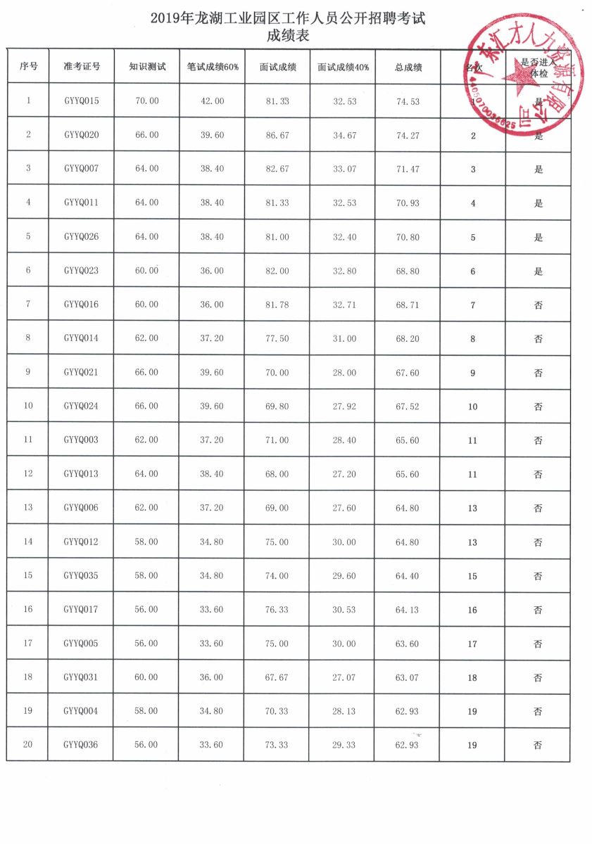 2019年龙湖工业园区工作人员公开招聘考试成绩公告