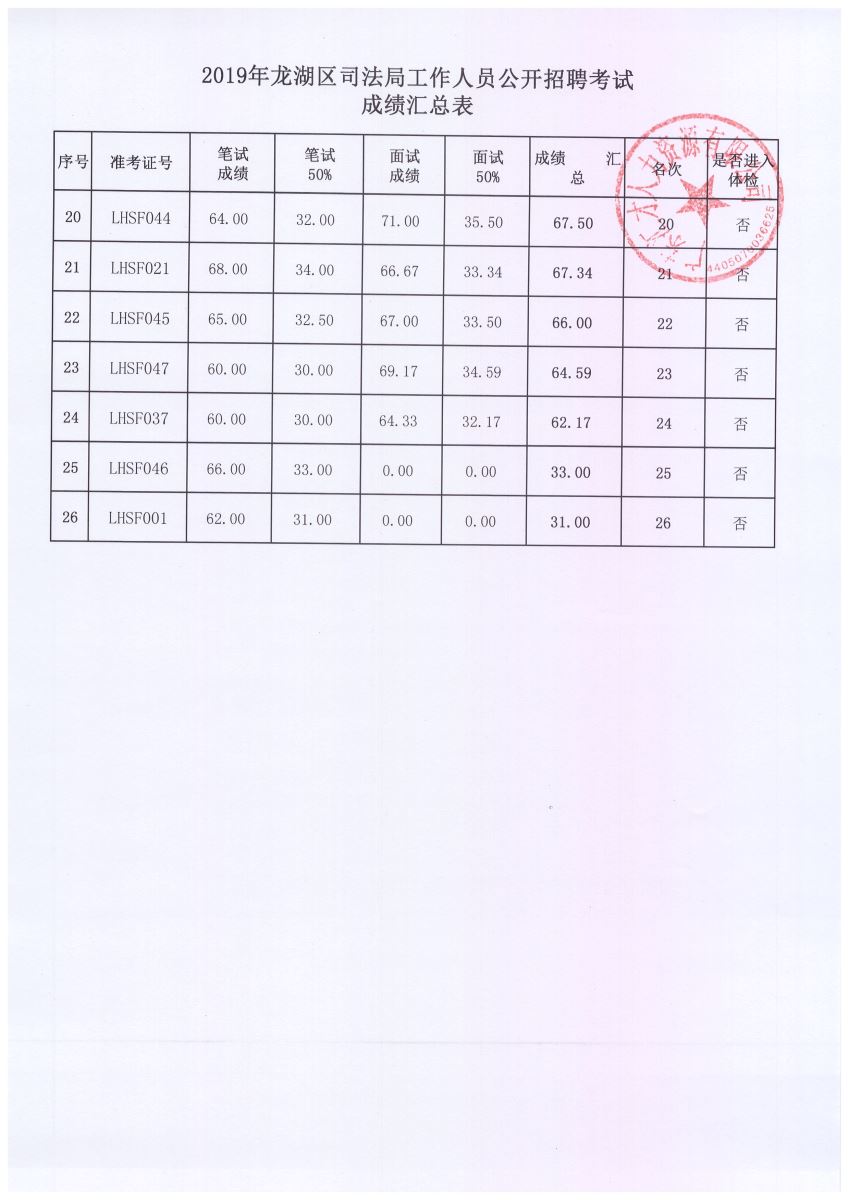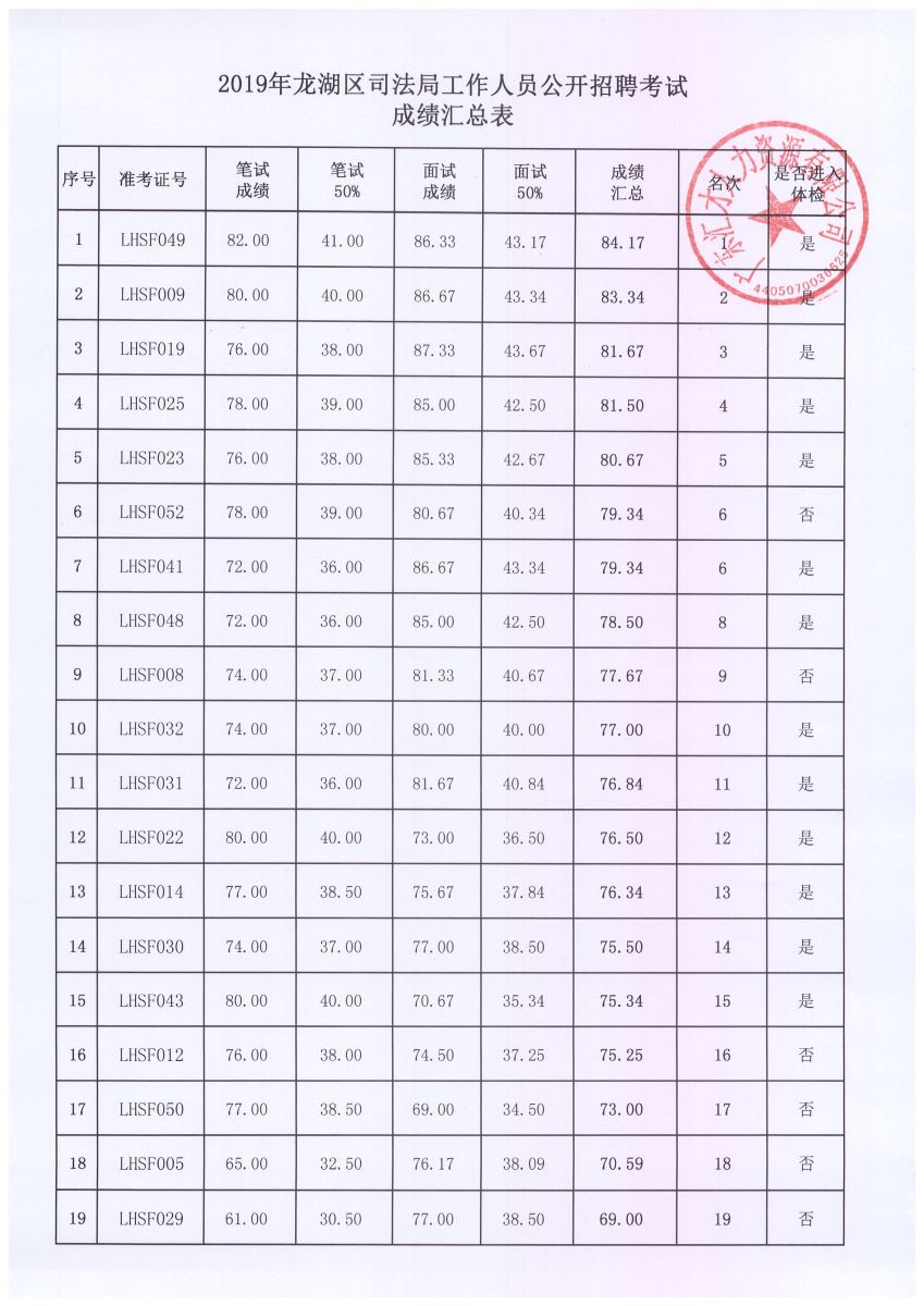 2019年汕头市龙湖区司法局工作人员公开招聘考试成绩公告