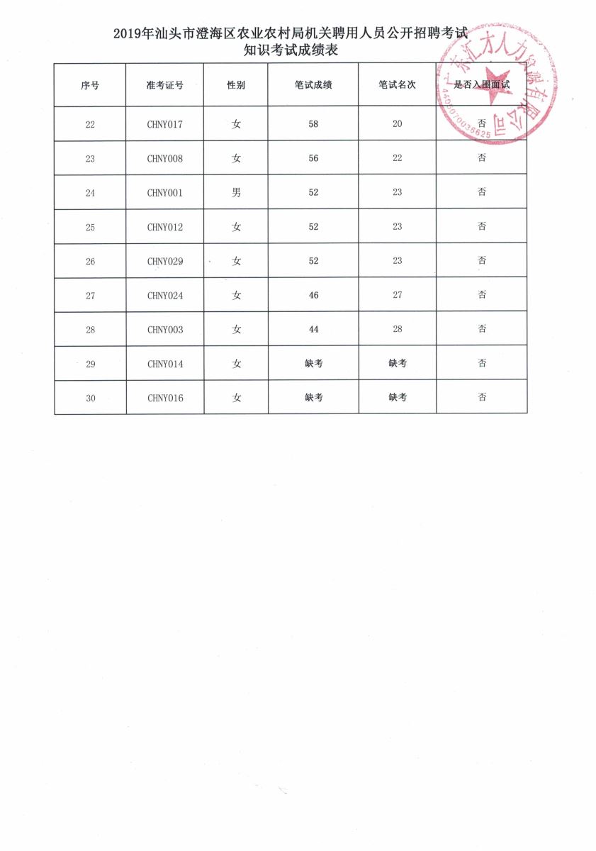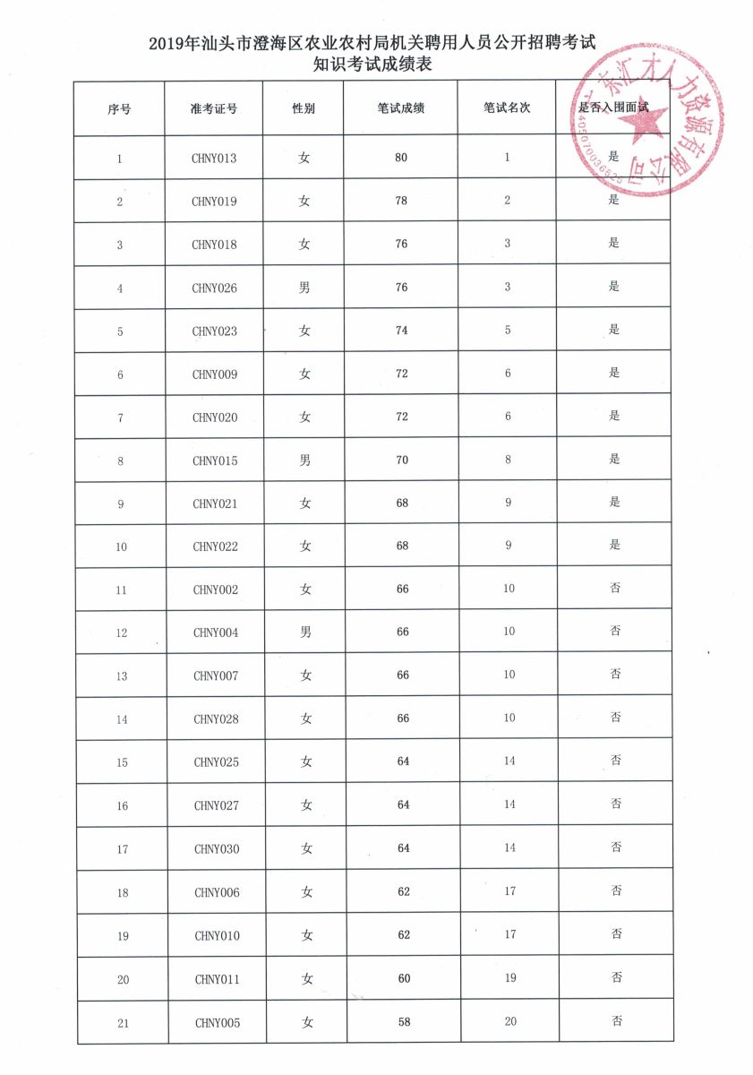 2019年汕头市澄海区农业农村局机关聘用人员公开招聘考试成绩公告