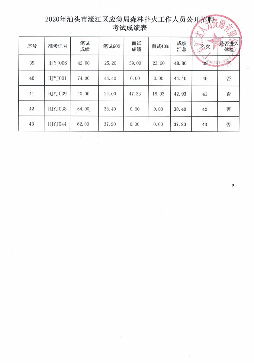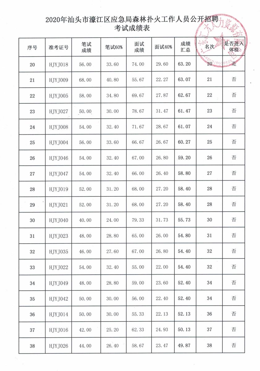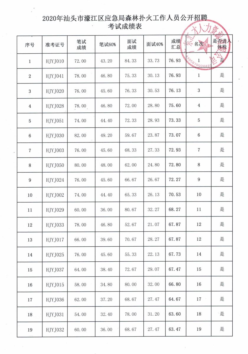 2020年汕头市濠江区应急管理局森林扑火队伍公开招聘考试成绩公告