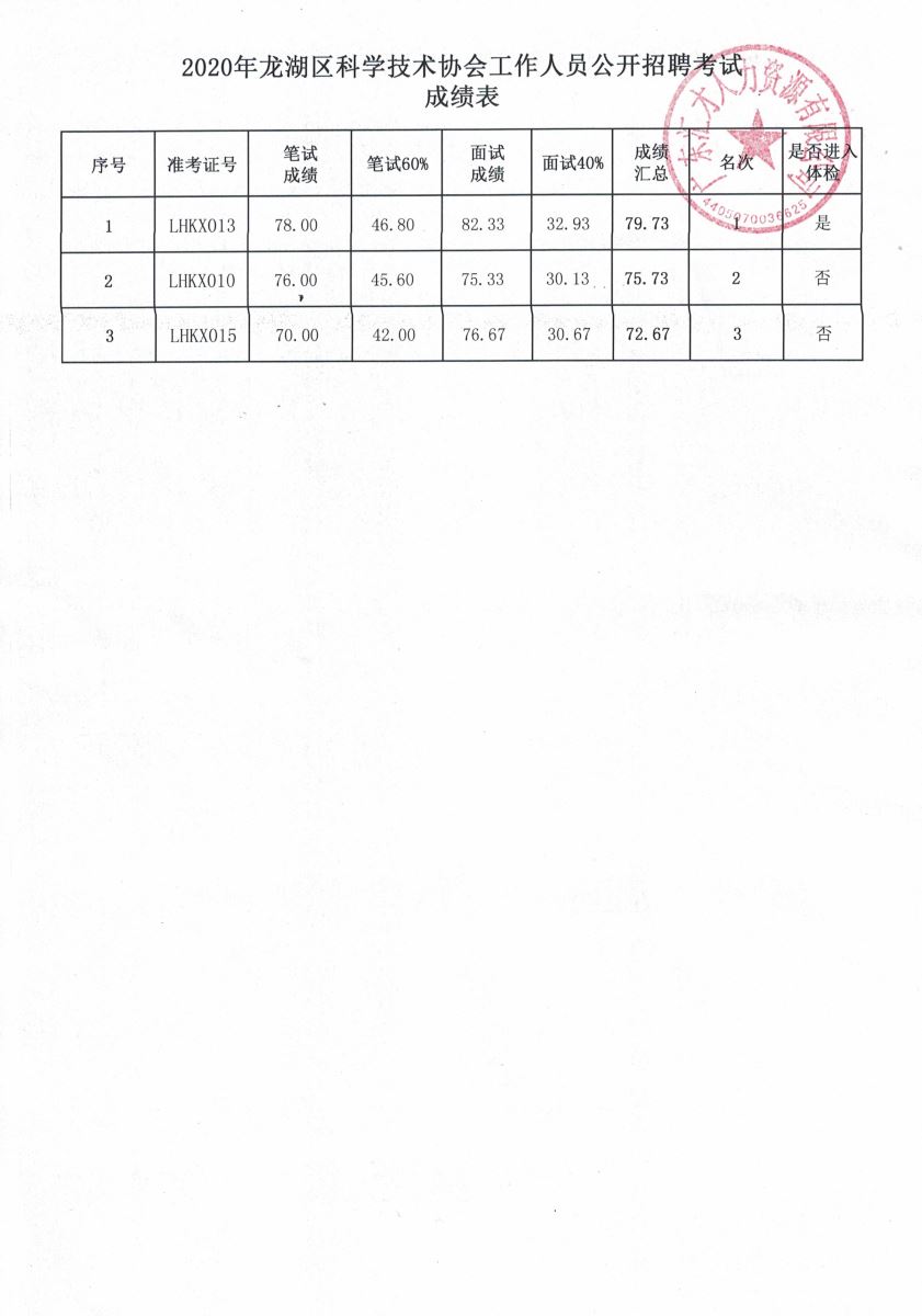 2020年龙湖区科学技术协会工作人员公开招聘考试成绩公告