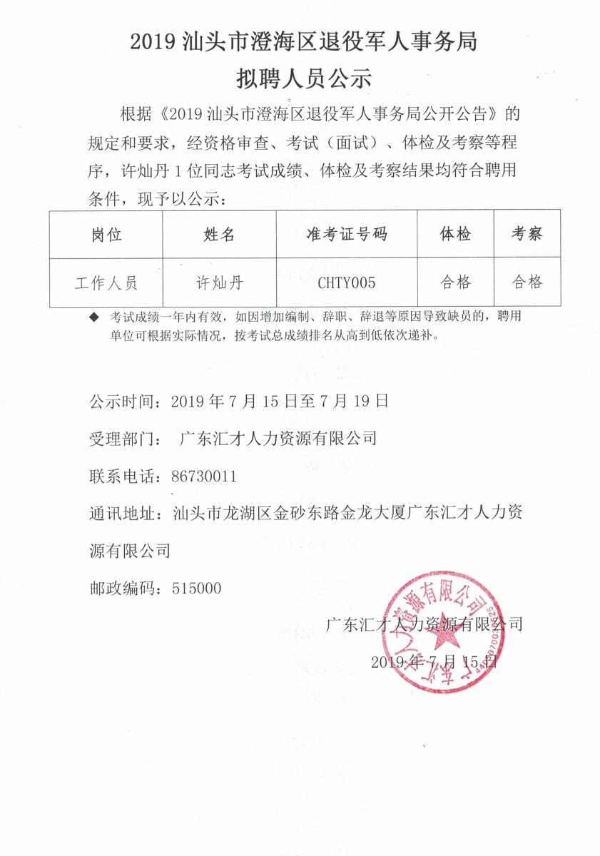 2019年汕头市澄海区退役军人事务局拟聘公示