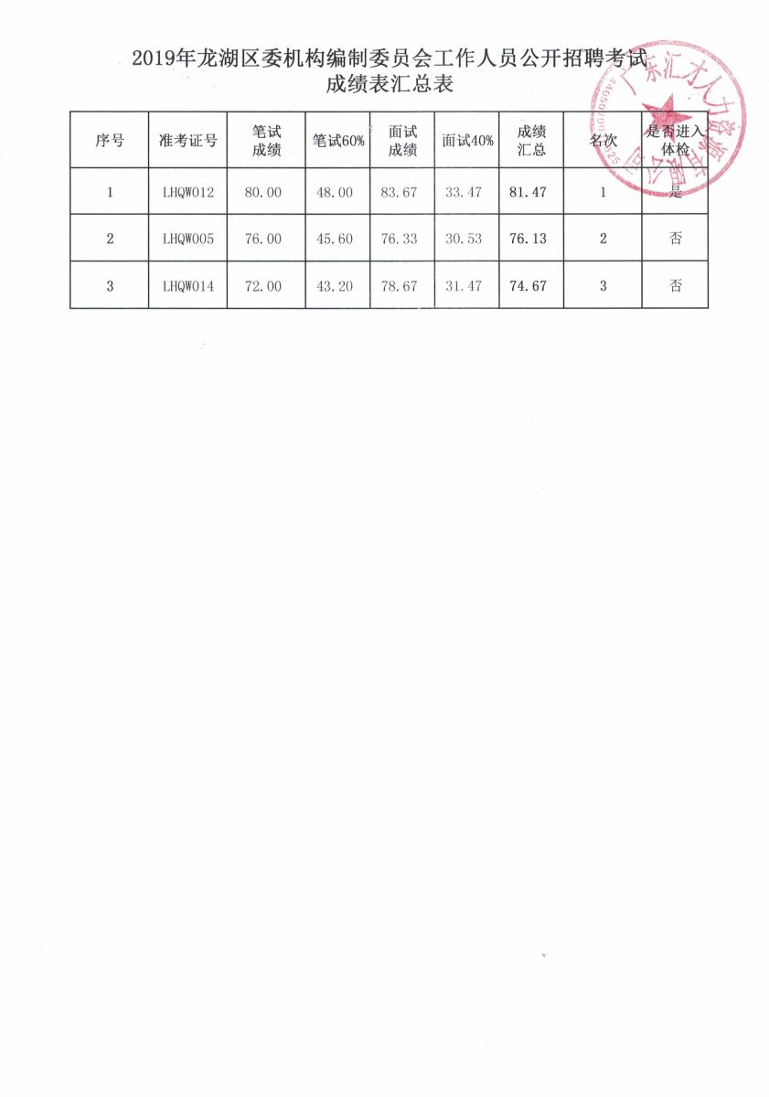2019年龙湖区委机构编制委员会工作人员公开招聘考试成绩公告