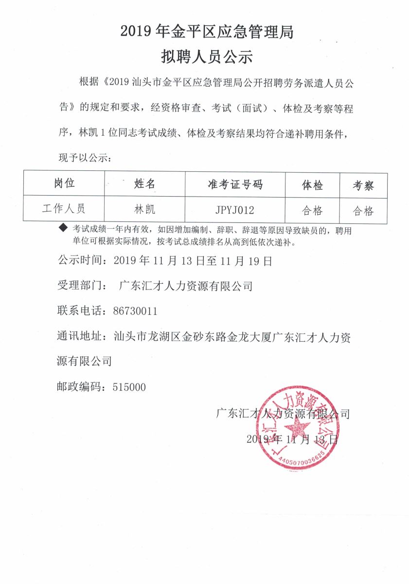 2019年汕头市金平区应急管理局公开招聘体检递补人员公告