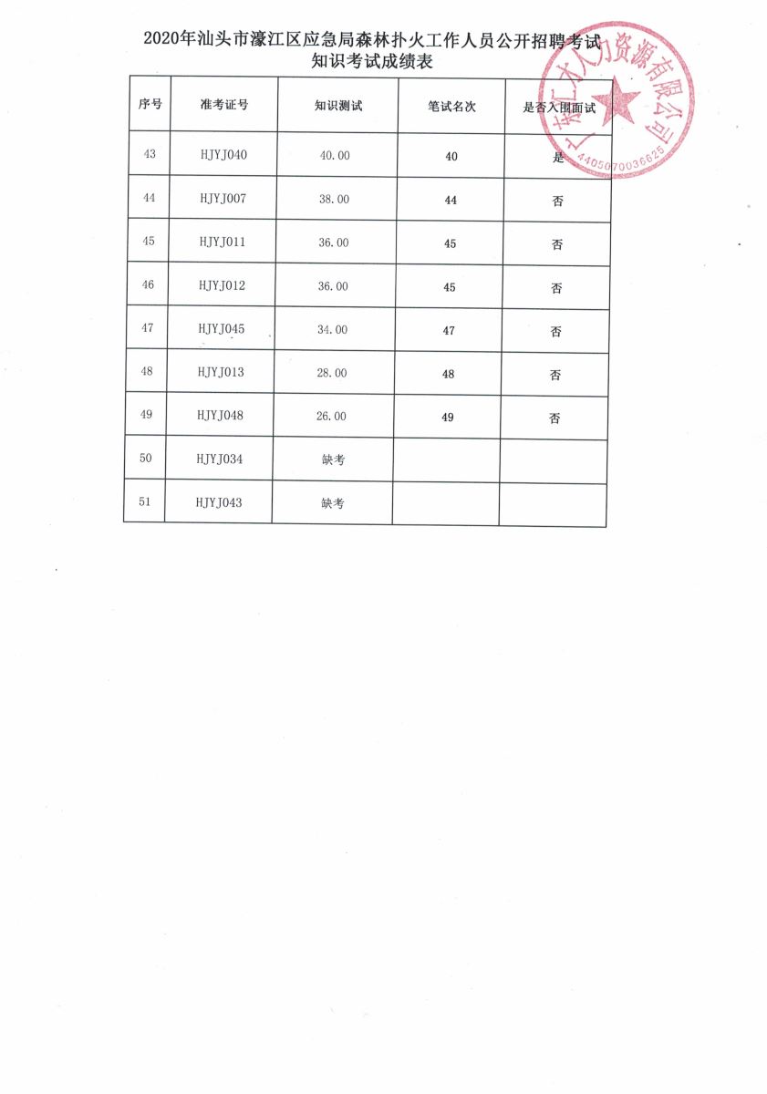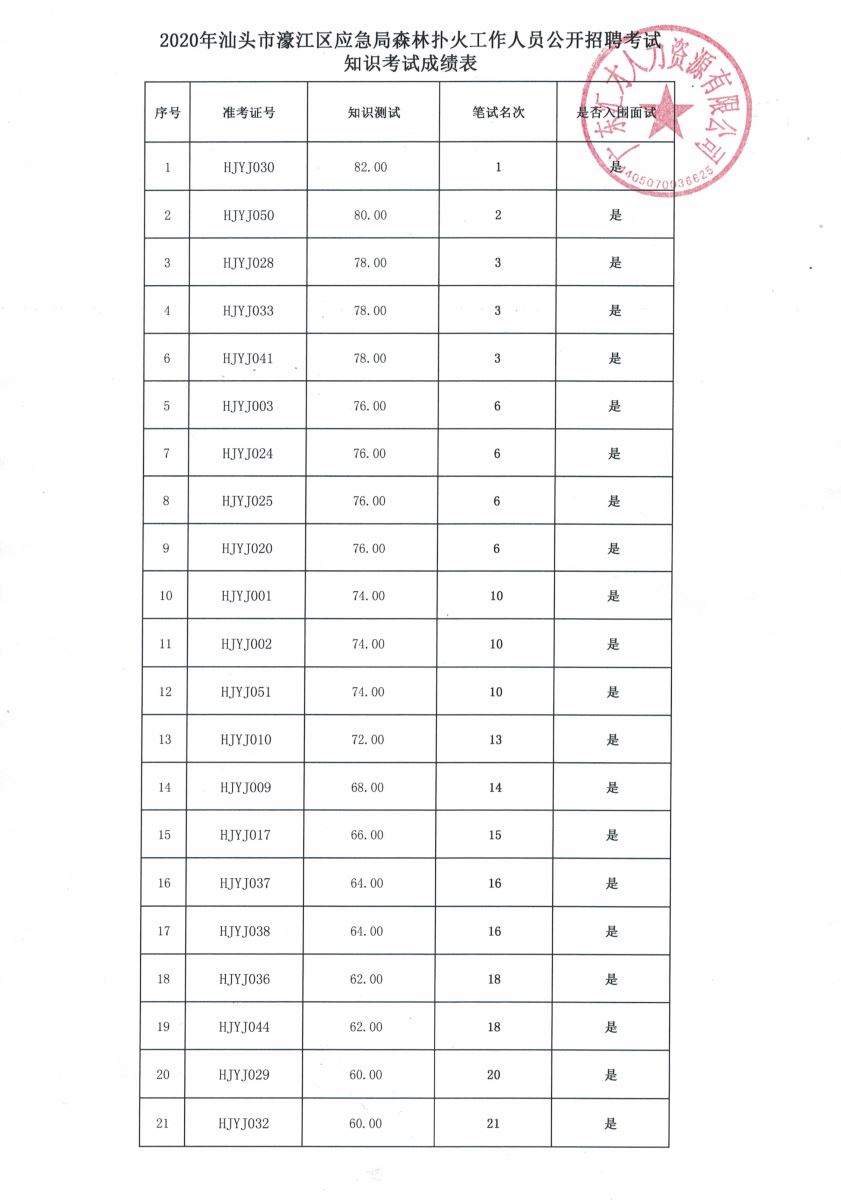 2020年汕头市濠江区应急管理局森林扑火队伍公开招聘考试成绩公告