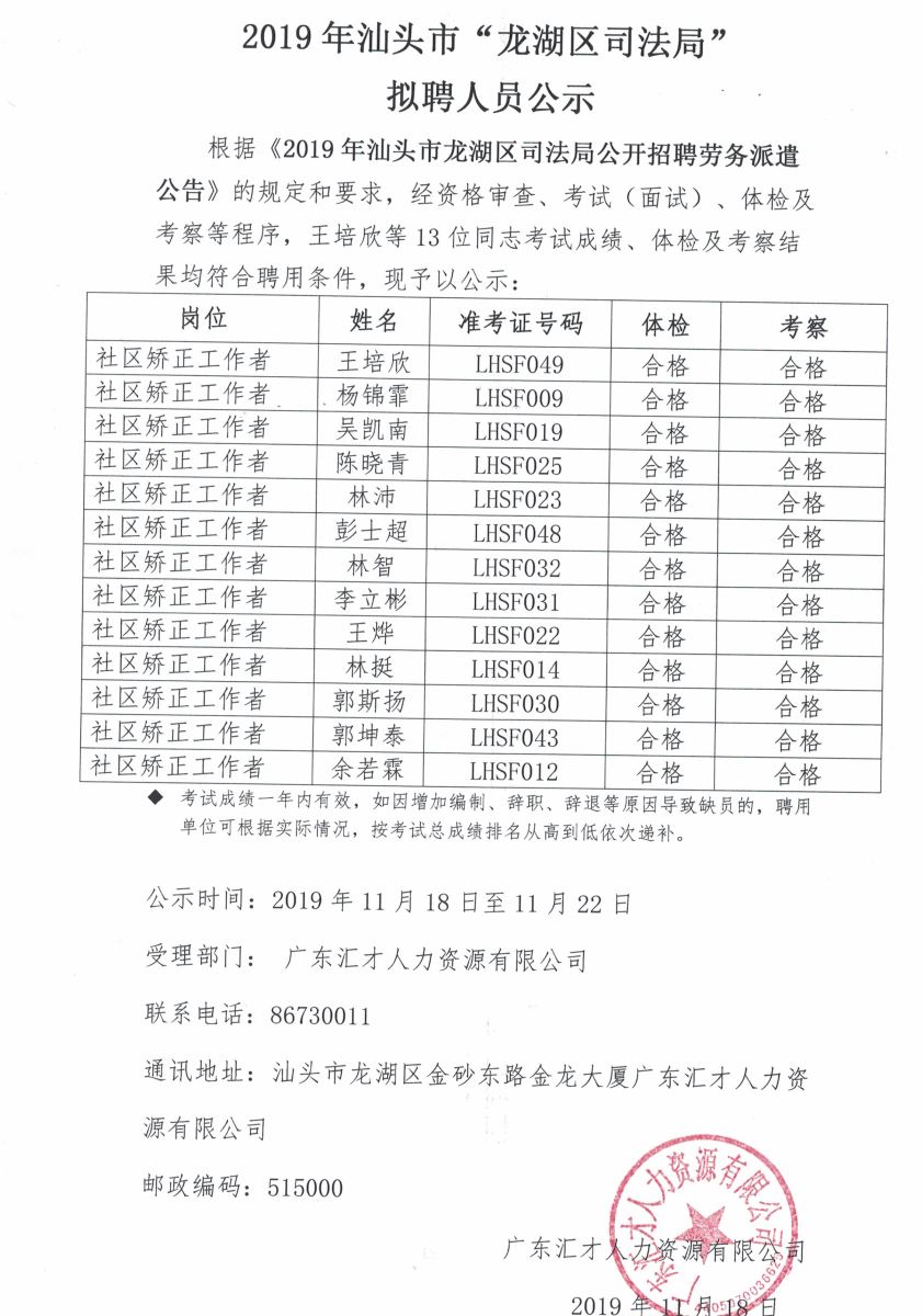 2019年汕头市龙湖区司法局拟聘人员公示